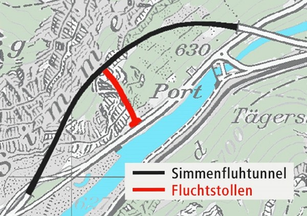 Le tunnel de Simmenfluh se trouve sur l’A6, à Wimmis. Peu après le tunnel, la route nationale mène vers la route du Simmental. D’une longueur d’environ 700 m, le tunnel a été construit entre 2000 et 2003 et était conforme aux normes de sécurité de l’époque. Quelques années plus tard, des normes plus strictes ont exigé l’aménagement d’une galerie de sauvetage. Une galerie de fuite d’environ 130 m de long a donc été construite. Elle part du milieu du tunnel et débouche à l’extérieur sur la route cantonale. La galerie est en service depuis l’été 2016.
